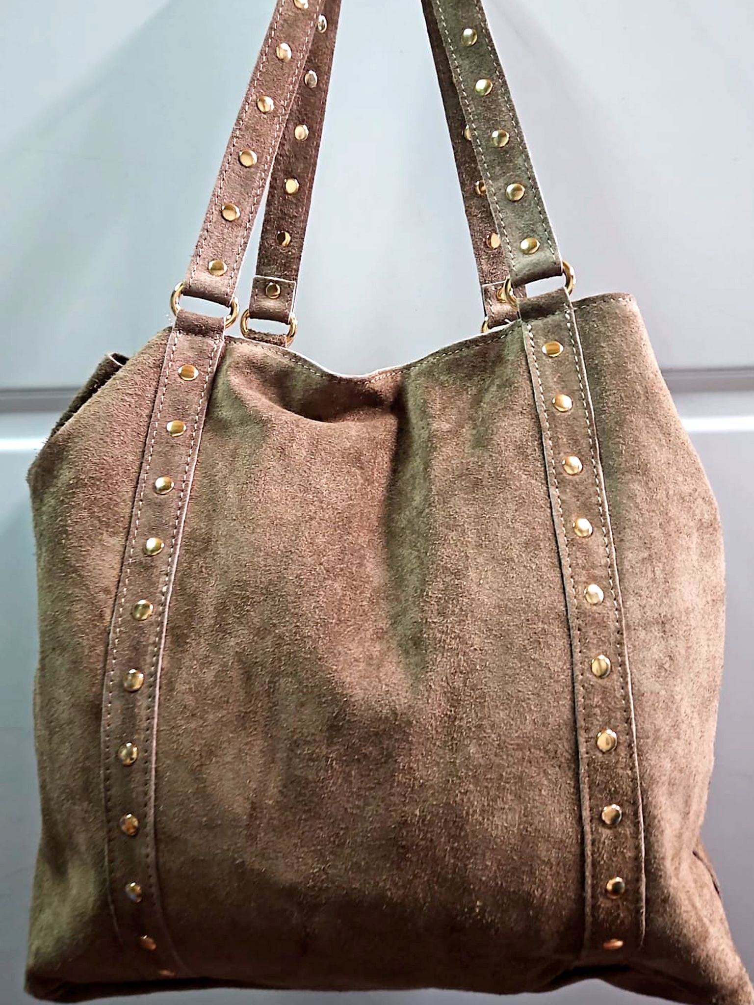 Bolso de piel de serraje modelo shopper con detalles de tachuelas en laton en la parte frontales del bolso y en las asas.
