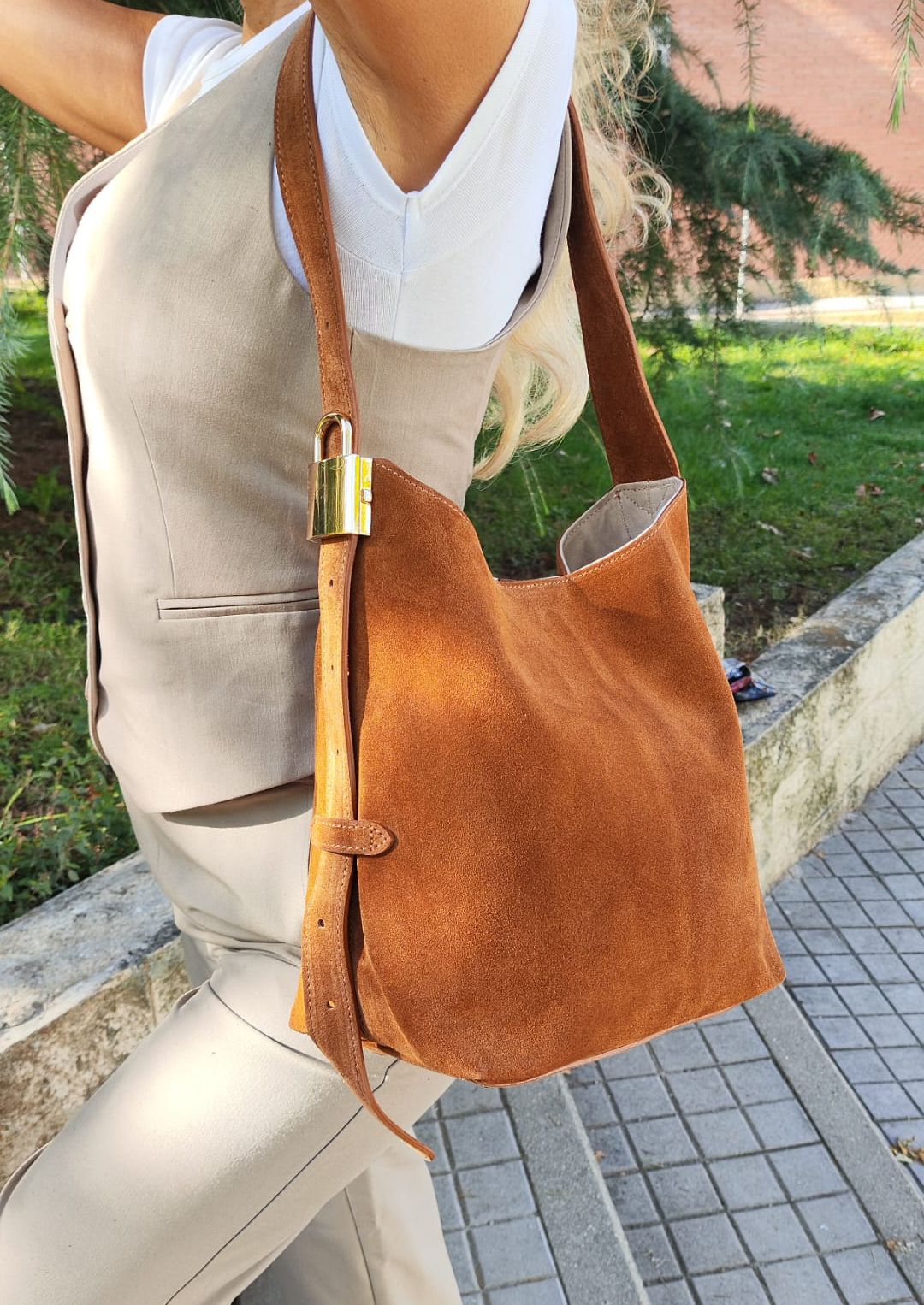 El bolso letizia es un bolso de ante rematado con un detalle encantador que es un candado dorado en el asa regulable. El ante es de la mejor calidad y tiene una cartera interior también en ante, forma parte de nuestra colección Otoño Invierno.