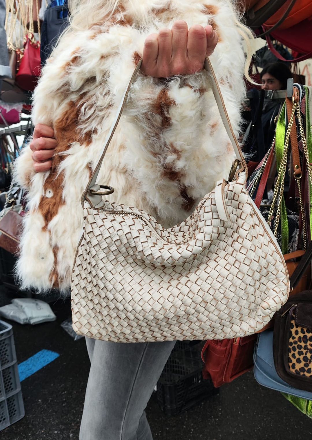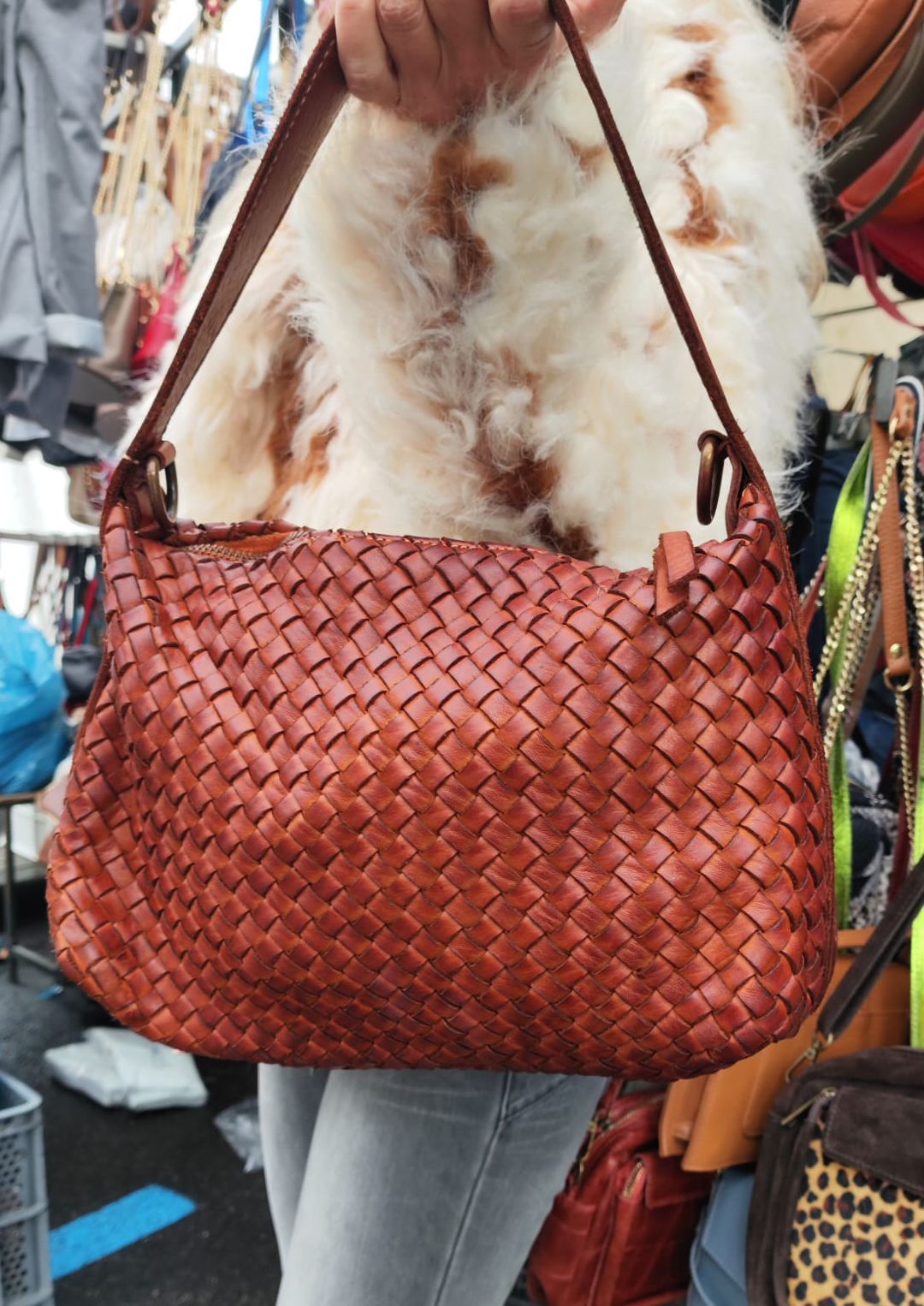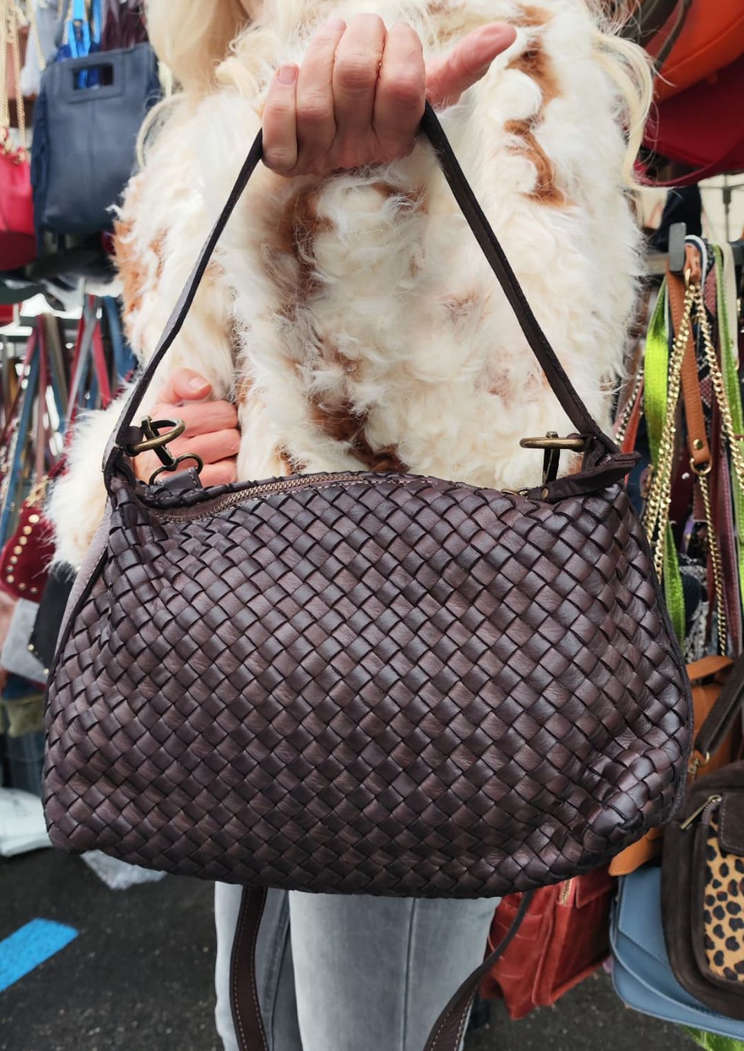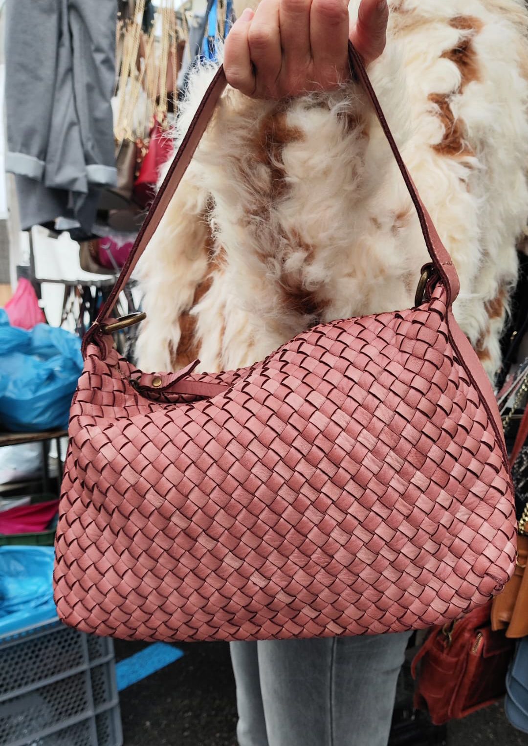 El bolso Pilar es un bolso de piel lavada, trenzado a mano. Tiene doble asa, larga y corta.