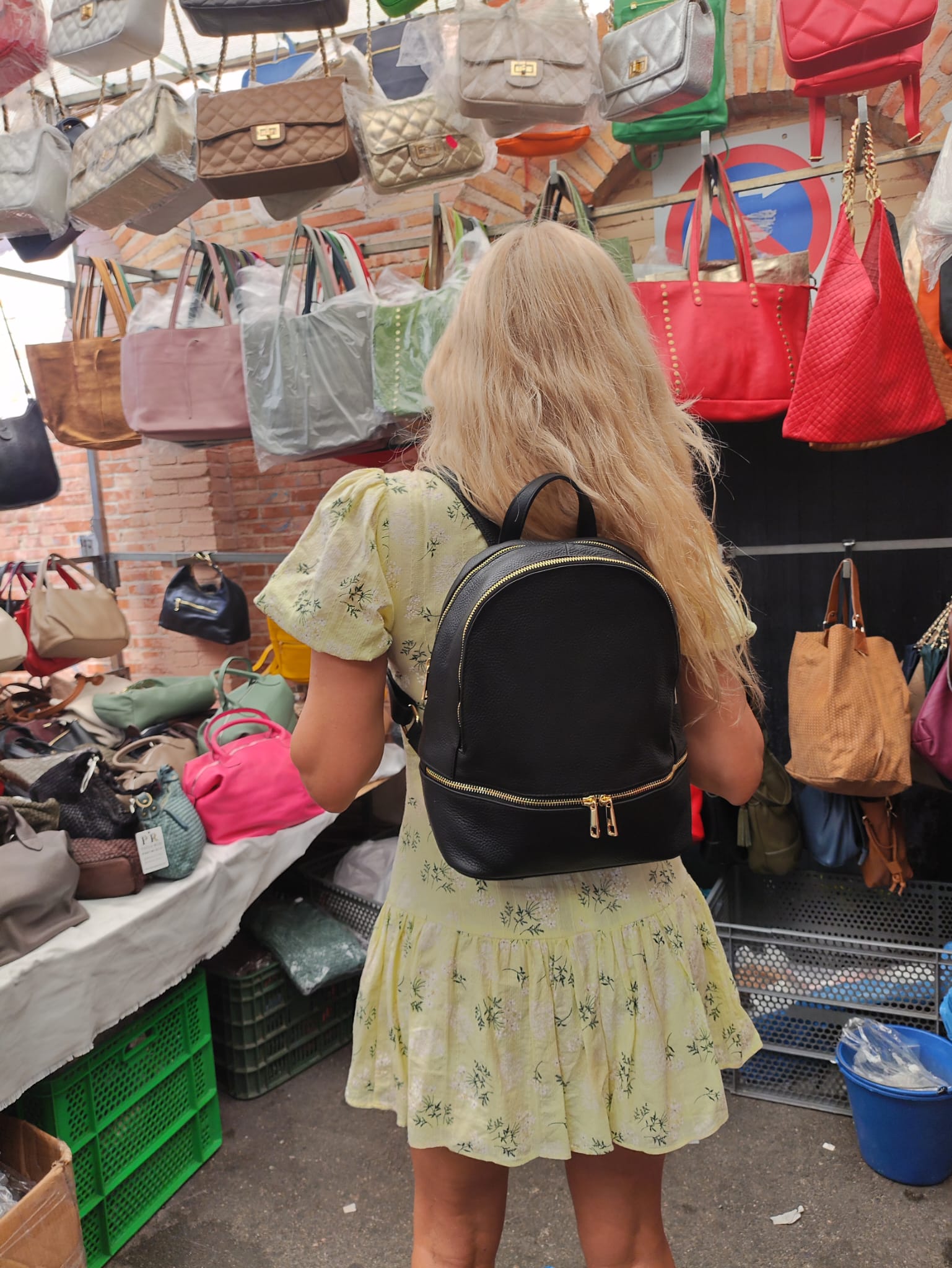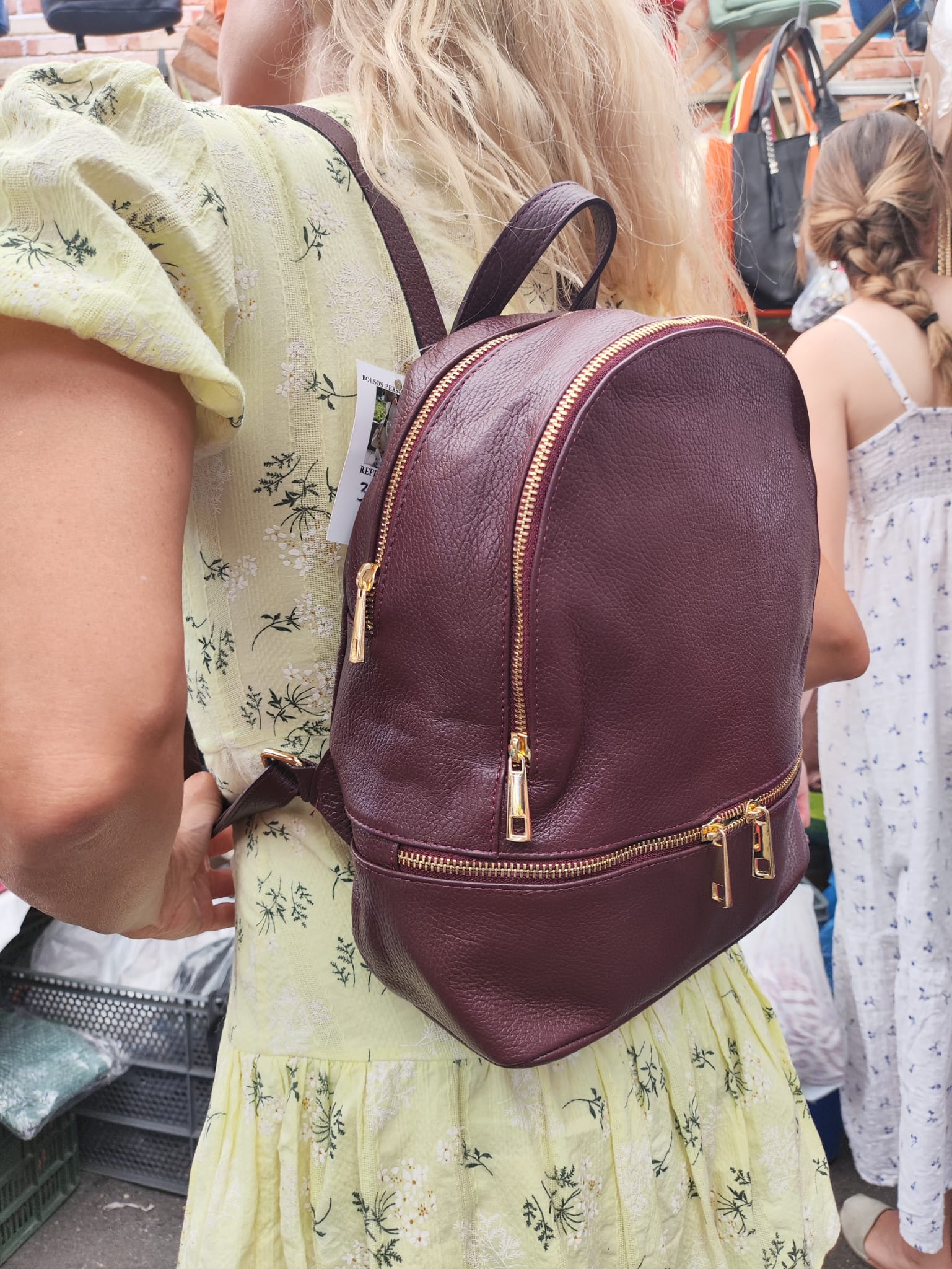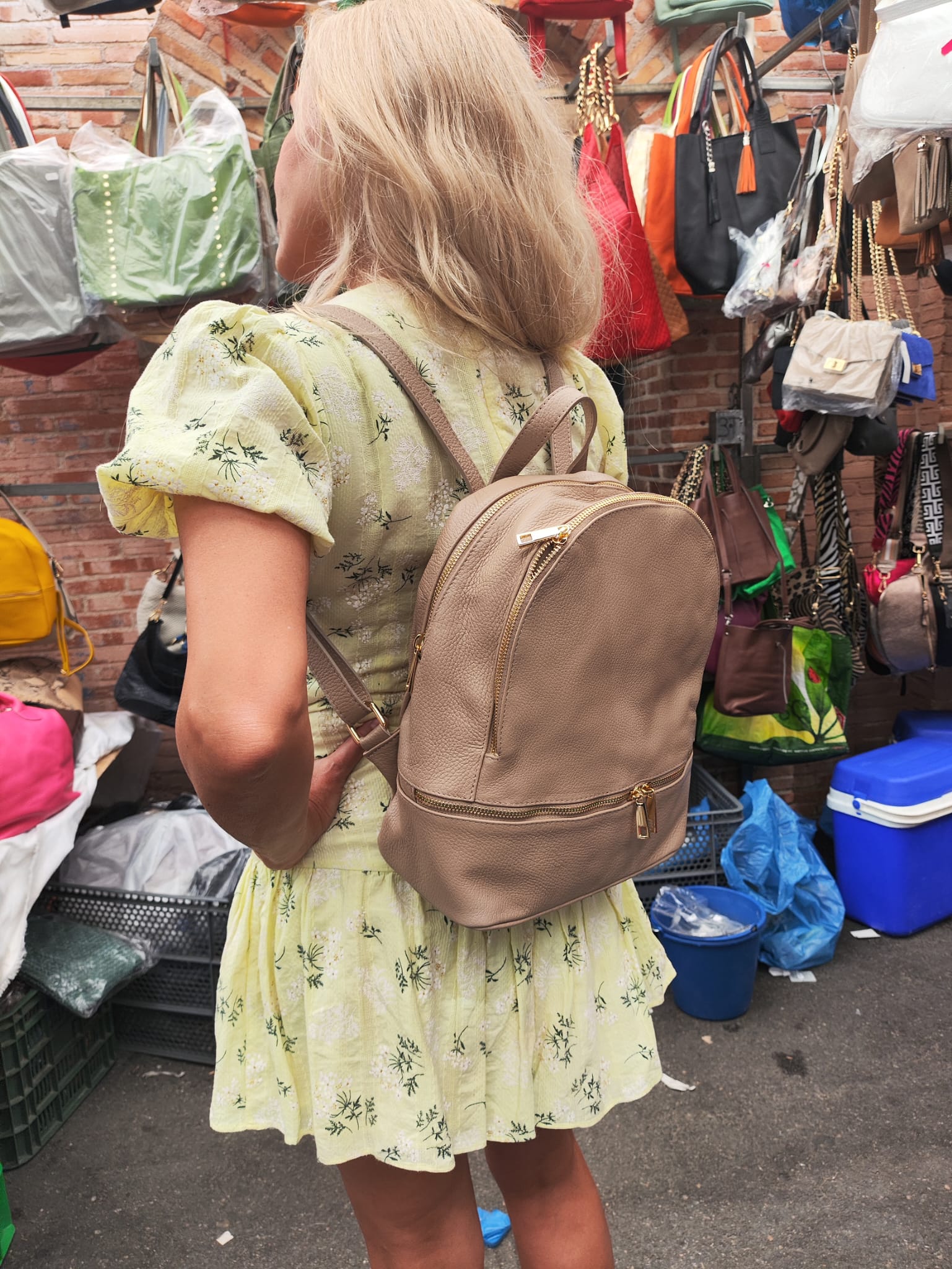 Mochila para mujer de piel con bolsillo delantero y bolsillo trasero, cremalleras doradas.